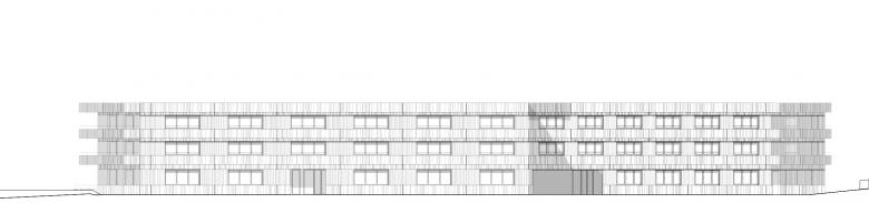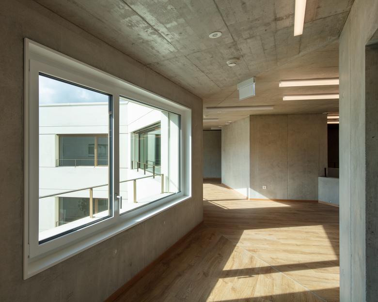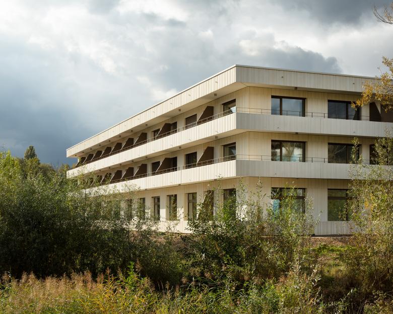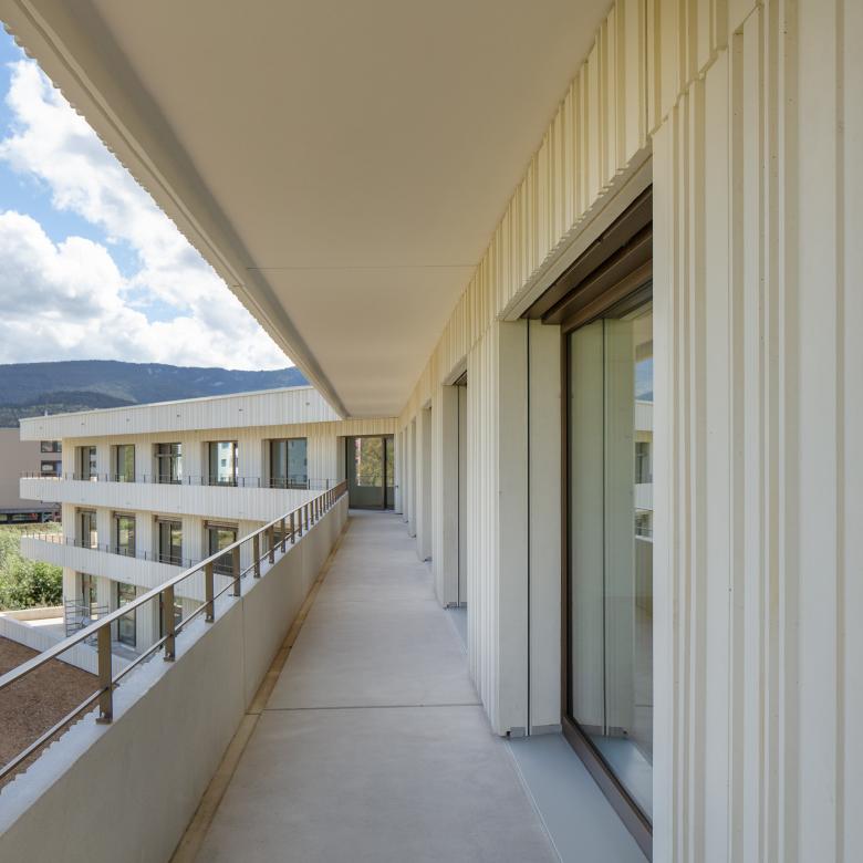 Niché au creux d’un méandre de la Sorne, le bâtiment se plie pour épouser les contours de l’environnement : le long de la rivière de larges terrasses s’ouvrent sur le monde végétal induit par l’hydrologie ; au nord le volume de faible gabarit s’inscrit dans la continuité du paysage bâti existant. Au cœur de cette forme hybride s’installe une cour ouverte à destination des aînés de l’institution. Les distributions horizontales bénéficient de l’apport de lumière de cette centralité et permet des parcours de qualité pour rejoindre son espace privé domestique, tout en faisant office de lieu de référence et de repérage.