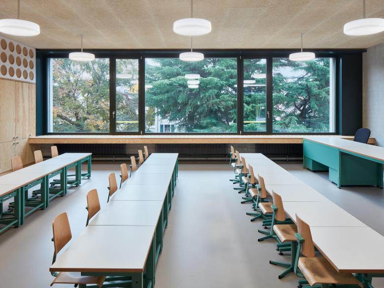 Im Schulgeschoss befinden sich sämtliche Schulnutzungen als zusammenhängende, geschossig organisierte Nutzungseinheit. Zwei Höfe mit unterschiedlichem Charakter vermögen dieses Geschoss einerseits zu zonieren und generieren andererseits unterschiedliche, spezifische Atmosphären. Der eingeschlossene Hof funktioniert als grüne Oase, der halboffene Hof kann zu schulischen Zwecken genutzt werden und als geschützter, beschatteter Pausenraum für die jüngeren Schüler dienen. Gleichzeitig entstehen interessante Durchblicke über die Höfe in die Tiefe des Gebäudes. Auf Grund des Branschutzkonzeptes können die Erschliessungsbereiche uneingeschränkt für schulische Zwecke genutzt werden.