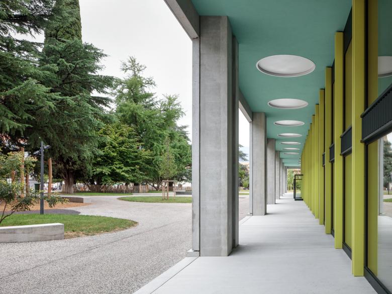Das neue Collège Courbet reiht sich in die Serie der öffentlichen Schulgebäude entlang des Place des Anciens-Fossés ein, komplettiert dieses Schulquartier und bildet gleichzeitig sozusagen als Schlussstein den Übergang zum Wohnquartier. Durch die Setzung des Gebäudes im rückwärtigen Bereich des Perimeters wird der zusammenhängende parkartige Grünraum, welcher die Axe zwischen Bahnhof und Altstadt begleitet, gestärkt. Der baumbestandene Aussenraum stellt einen spezifischen, charaktervollen Raum dar, den es zu erhalten, resp. zu nutzen gilt. Das zweigeschossige, gedrungene Gebäude wird stark mit dem Baumbestand in Verbindung gebracht und fügt sich pavillonartig in diesen Parkraum ein. Die grossen, alten Bäume werden erhalten und in eine platzartige Umgebungsgestaltung eingebunden. Neu sollen sie im Bereich des College als Inseln in einen grosszügigen, befestigten Platz eingesetzt sein. Der Anteil an Ausschnitten wird graduell erhöht, sodass sich im Süden der Anlage der Park in seiner ganzen Stärke entfalten kann.