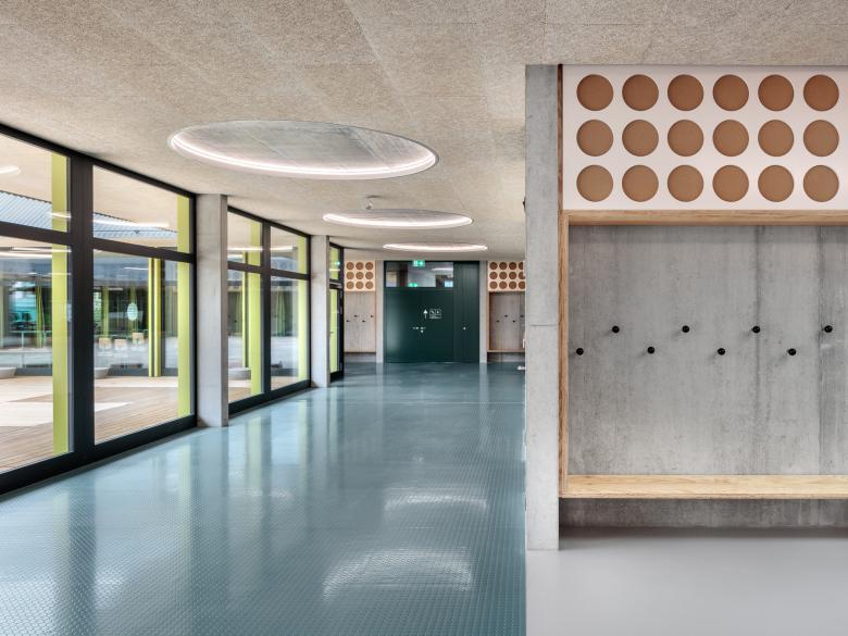 Die Dreifachturnhalle ist selbstverständlich ins Gebäude eingebunden, wobei das Galeriegeschoss zur Attraktivitätssteigerungs des Erdgeschosses wesentlich beiträgt. Durch die Befensterung im Erdgeschoss ist sie grosszügig mit natürlichem Tageslicht versehen.