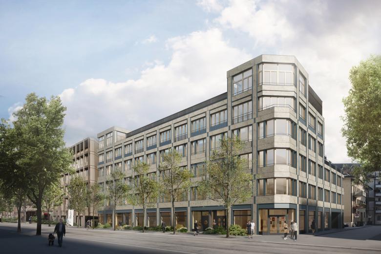 Ausgehend von einer ortstypischen geprägten Architektur, wird diese Formensprache neu interpretiert und in ein zeitgemässes Bürogebäude transferiert. Die hinterlüftete Fassade wird klassisch gegliedert mit Sockel, Mezzanin und Dachgeschoss. Profilierte Aluminiumelemente rahmen den Stein und ermöglichen maximale Freiheit der Gestaltung der Bürogeschosse.