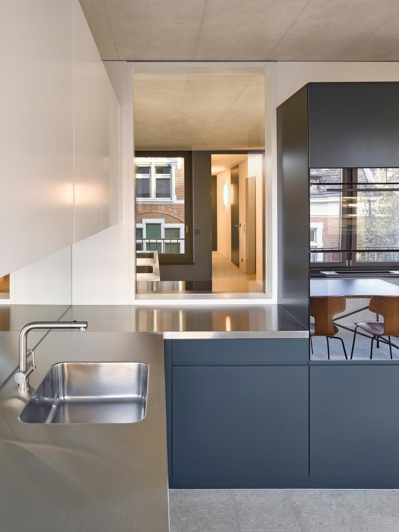 Auch das Innere verpflichtet sich demselben Gestaltungsgedanken. Auf Grund der räumlichen Vielfalt und Reichhaltigkeit der Wohnungen, kann mit einfachen, rohen Materialien agiert werden: Betonböden mit eingelegten Anhydritintarsien, Zementspachtelwänden und rohe Betondecken verleihen den Wohnungen eine angemessene, zeitlose Eleganz und grosse Wohnlichkeit.