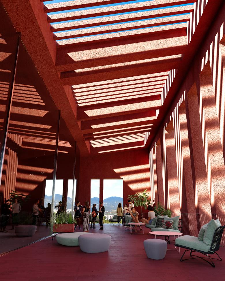 Über die schönen Materialien, Farben und Texturen Tiranas hinaus stehen die Menschen im Zentrum der räumlichen Organisation der Stadt. Im gesamten Stadtbild sind die Erd- und ersten Stockwerke der Gebäude hauptsächlich sozialen Räumen vorbehalten und wirken als Verlängerung der Stadt. Inspiriert von diesem Prinzip sowie von der reichen Geschichte des Gebiets – dem Herzstück einer Bewegung, in der Tausende Studierende auf Dächer und Loggien stiegen und wirtschaftliche Veränderungen sowie den Rücktritt der kommunistischen Regierung forderten – wurde entschieden, dass der Campus in Tirana zu einem Zentrum für sozialen, kulturellen und diplomatischen Austausch zwischen Studierenden, EU-Delegierten und der Bevölkerung wird.