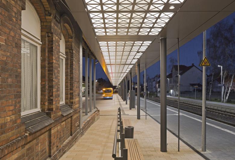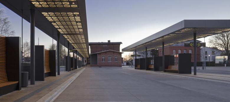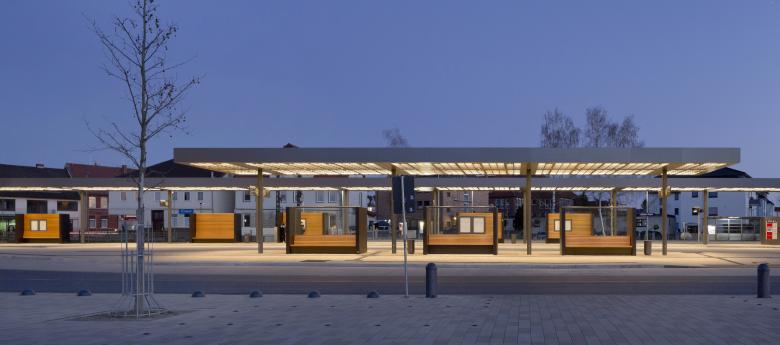Die prägenden Elemente des Busbahnhofs sind die neuen Überdachungen der Haltestellen, die sich auf zwei Plattformen verteilen. Die vorgeschlagene modulare Konstruktion ermöglicht spätere Erweiterungen der überdachten Bereiche. Die Sitzgelegenheiten und Info-Module werden in die mit Holzleisten belegten Rückwände der überdachten Warteboxen aus eingefärbtem Beton einbeschrieben. Durch die in die Dachunterseiten integrierten Lichtdecken erhalten die Wartebereiche eine dezente und stimmungsvolle Illuminierung.
