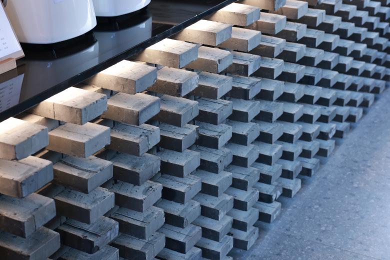 整栋建筑为木结构建筑,周围环境古朴幽静,同时店主也希望店铺的整体氛围能和古村落保持一致,因此在整体材质上我们选择了砖、木这类带有传统和自然特色的材质,来呼应场地的特殊性。天然胡桃木和深灰色砖材被用作室内空间的主要材料,带来一种和谐而充满美感的对比。胡桃木的温馨气息与灰色砖材相得益彰,后者为吧台和一层的墙壁带来独特的肌理,同时也为整个空间赋予了精致的细节及空间特征。