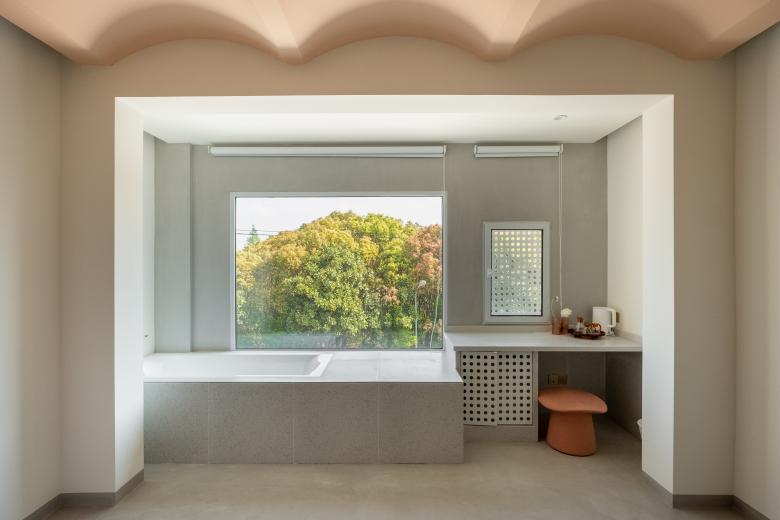 业主和我们都十分注重民宿的互动功能。主楼的底层空间原本各成体系,被全部打通作为公共空间,成了住客阅读观景、互动交流的地方。吧台、餐桌一应俱全,还有面包机这样简单的用具,满足了部分住客想自己动手做早餐的需求。