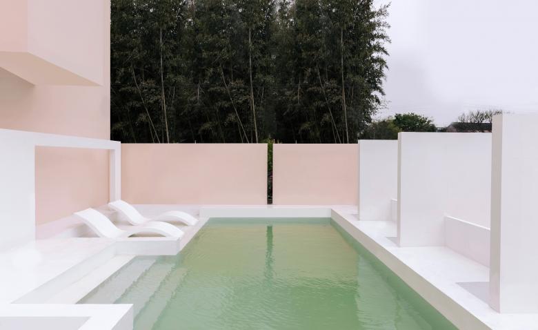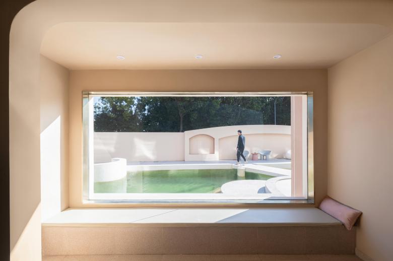 庭院内部的改造以两个泳池为中心进行设计,同时对照室内进行造景。水乃万物之源,有水就有了生命,甘冽清明的池水赋予了院子灵性,其流动的动态特质和周围静态的环境形成有机统一,令神秘与梦幻交织于此。泳池中穿插布置了台阶和下沉休息区,形成了多样化的趣味空间,让每个人都能找到属于自己的安静角落。