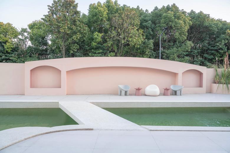 栖梦·花溪整体呈现为粉色,使用冷静的中性灰作为调和,精心调配的色块比例加以金色材质作为点缀。同时,硬装材料的选择也以坚硬感的材质为主,置入玻璃、金属、亚克力,辅以穿孔板、水磨石和微水泥等再用布艺软装作为辅助,形成细腻刚硬的有机搭配。坚硬的材质下,温柔无处不在。不仅构建出如梦似幻的建筑空间,还展现出刚柔并济的特质。