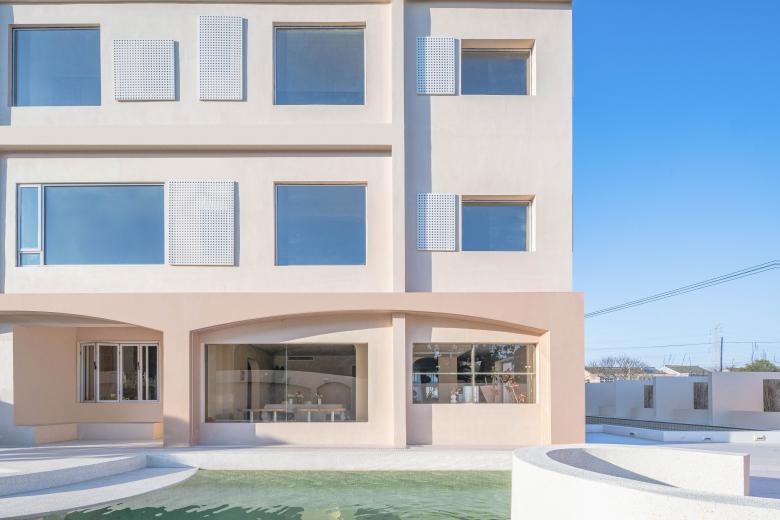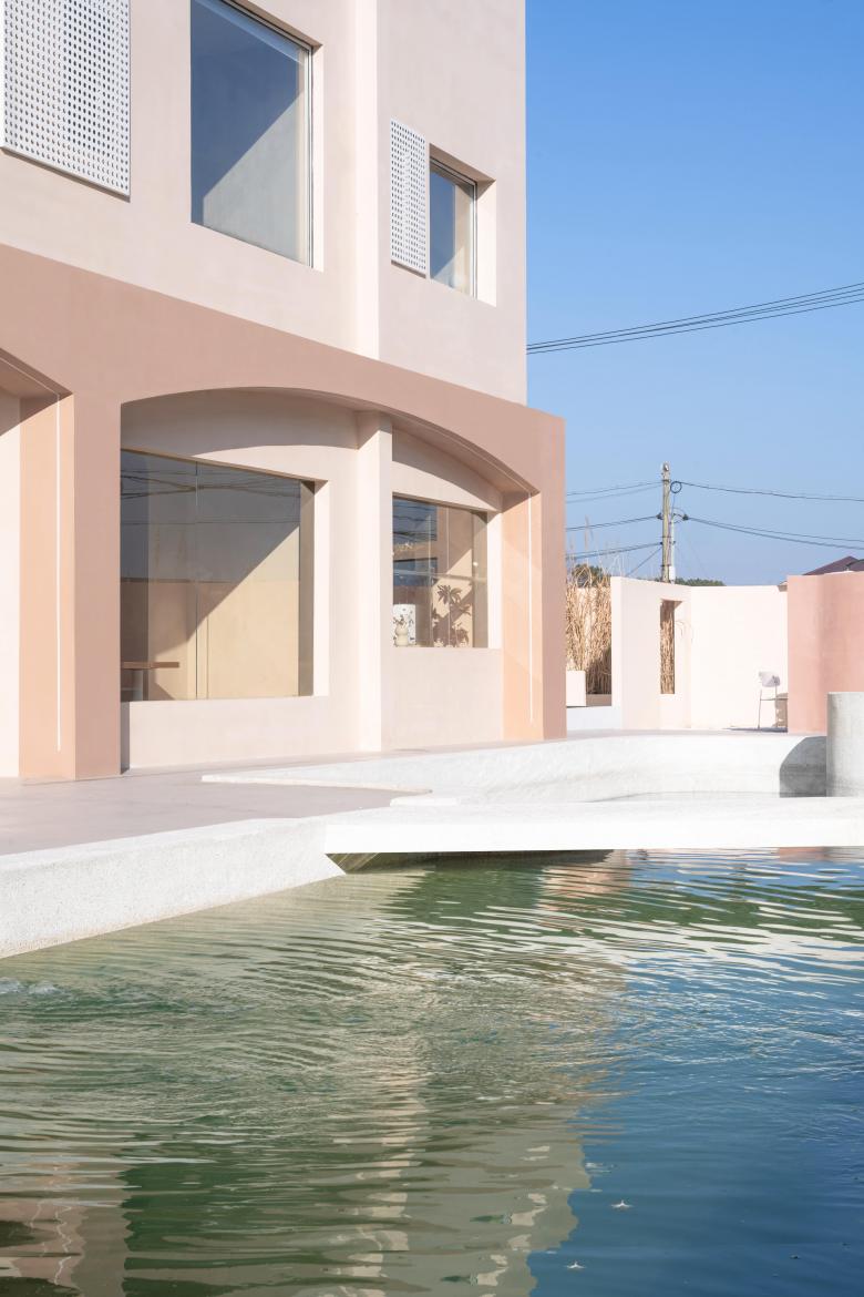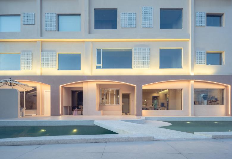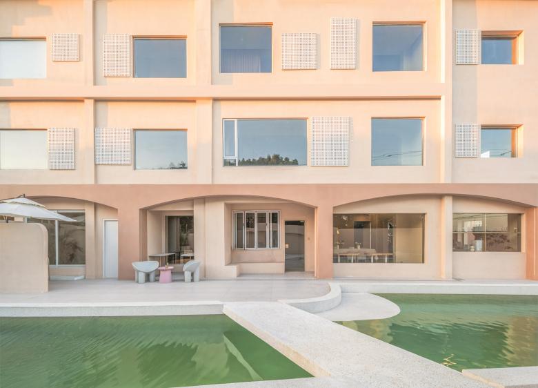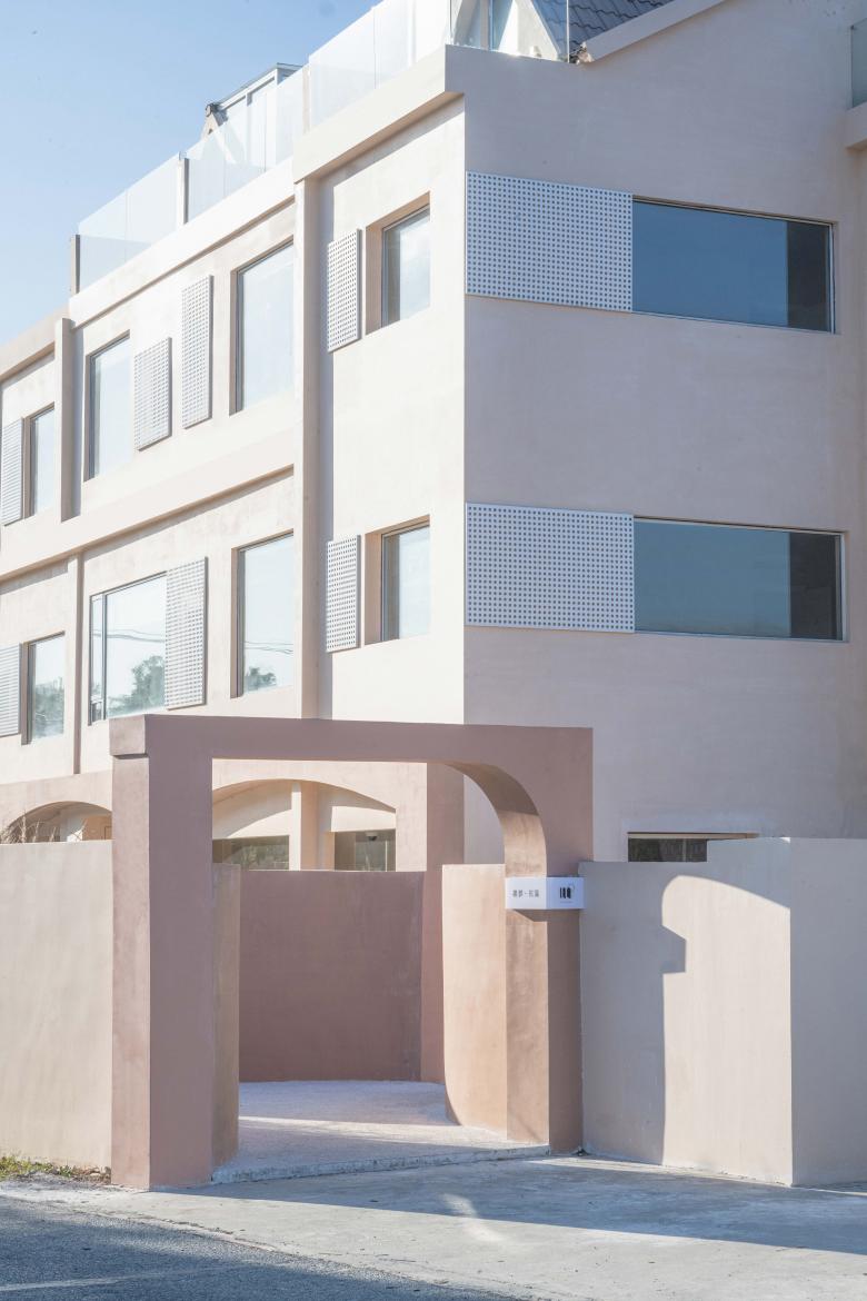 光之于空间,犹如空气之于生命,我们设计格外重视光影的营造。在整修室外空间时,首先对门窗进行重装,考虑到造价问题,我们没有对建筑外立面进行大的修改,只是做了拆除与粉刷,用大面积的粉色确立起整间民宿的视觉特征。在挑选外立面装饰时,十分注重“自然采光”的原则,用穿孔板形成块状感,巧妙地利用自然光线突出室内环境的层次,营造出斑驳陆离、明暗有致的视觉效果。