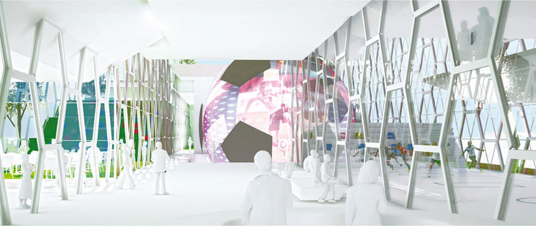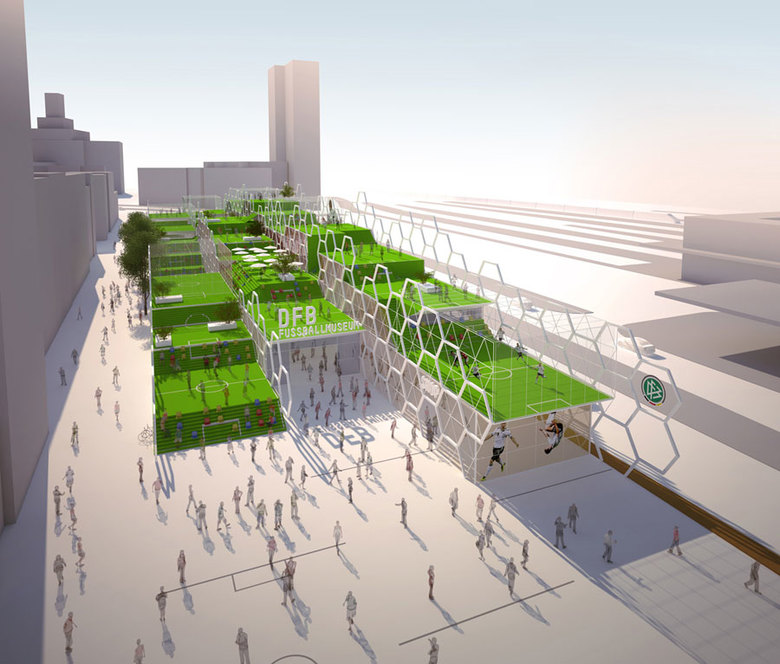 Das Dach des Museums wird als begehbare Terrassenlandschaft hergestellt – eine urbane Spiel und Erlebnislandschaft für Fußballspiel, Zuschauer, Stadtspaziergänger, Cafeterrassen, Liegeflächen, etc. entsteht: Eine Arena auf dem Museum in der Stadt.