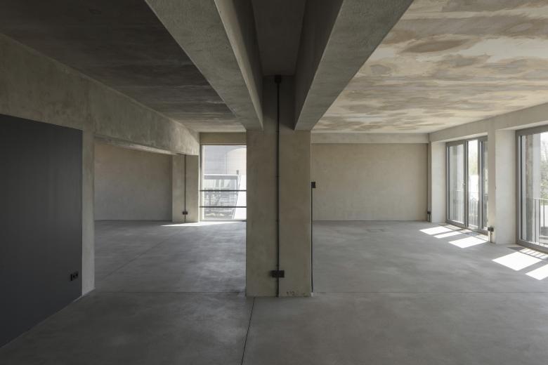 Das Erdgeschoss erhält großzügige Terrassen zur Spreeseite. Die Fenster der Bestandsfassade werden erneuert. Dabei wird spreeseitig die Brüstungsfläche der vorgehängten Betonelemente herausgetrennt und Schiebetüren in der Ebene dahinter installiert. Zwischen Betonelement und neuer Fassadenebene ist ein mobiler Sonnenschutz vorgesehen.