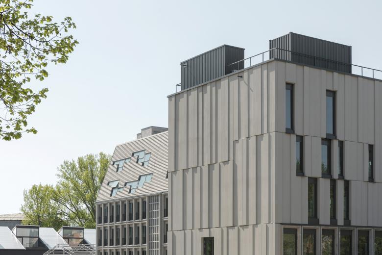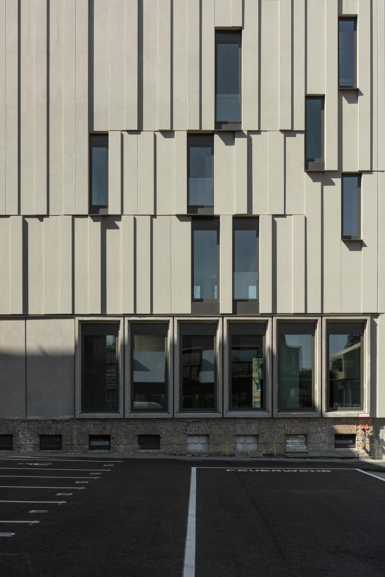 Fassaden der Längsseiten werden als schräggestellte Dachflächen errichtet, die der Giebelseiten als vertikale Fassaden. Die primäre Tragkonstruktion folgt dem vorhandenen Tragwerk in den Bestandsgeschossen und wir in Mischbauweise aus Stahl und Holz nach den Erfordernissen der Tragwerksplanung und unter Berücksichtigung der Anforderungen des Brandschutzes aufgestellt. Die skelettierte Konstruktion wird über Kerne und Wandscheiben ausgesteift.