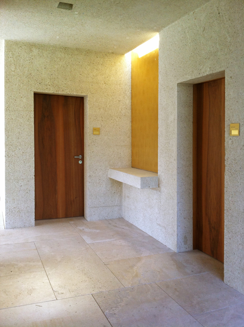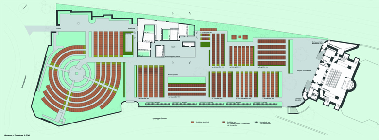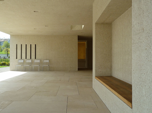 Ein niedriges, von Höfen und Aussenbereichen durchsetztes räumliches Gefüge aus gestocktem Kalkstein-Beton generiert die geforderten Räume. Mehr Skulptur als Haus integriert sich das Volumen in die Friedhofslandschaft und ergänzt das Layoutder reorganisierten Grabfelder mit einem gedeckten Abdankungsplatz.