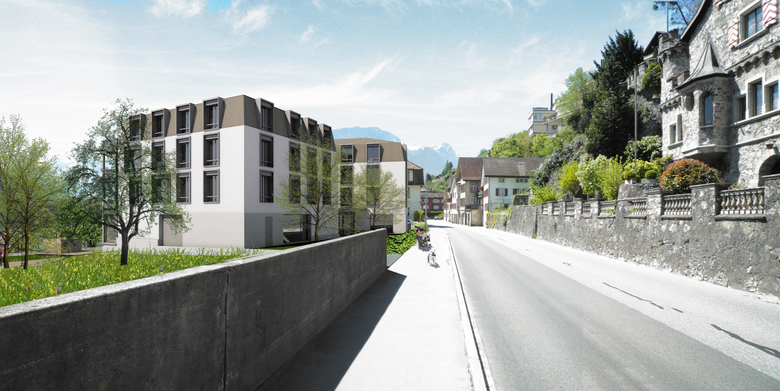 Das zu bebauende Grundstück liegt im östlichen Ausläufer der Kernzone von Weesen. Um die Körnung der bestehenden, dem historischen Ortskern vorgelagerten Häuserzeile zu respektieren werden zwei Gebäudevolumen vorgeschlagen. Dieses Ensemble markiert neu die östliche Zugangsituation zum historischen Städtli. Durch die Gebäudestellung entsteht strassenseitig ein kleiner Platz, welcher den öffentlichen Charakter der Erdgeschossnutzung akzentuiert und Distanz zum steinernen „Schlössli“ auf der anderen Strassenseite schafft. Zudem orientieren sich die Bauten auf der leicht erhöhten Parzellenlage klar zum See und zum grandiosen Alpenpanorama.