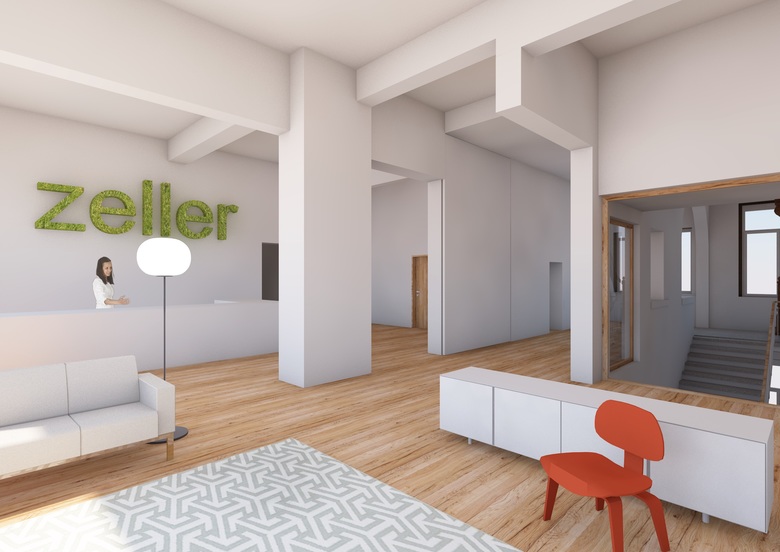 Die ursprüngliche Gebäudestruktur bleibt an den Unterzügen ablesbar. Der rückseitige Büroanbau im ersten Obergeschoss wird zugunsten einer begrünten Terrasse rückgebaut. Über einen "Kräutergarten" sieht man im neuen Empfangsbereich auf die bestehenden Produktionshallen.