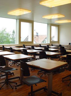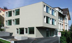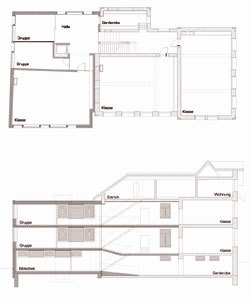 Alt- und Neubau werden unter gegenseitigem Respekt zusammengefügt. Von Aussen setzt sich der Anbau - trotz subtilen Gemeinsamkeiten wie Traufhöhe und Fenstergewände - selbstbewusst vom bestehenden Schulhaus ab. Im Innern jedoch verbinden sich Alt und Neu zu einer Einheit von unerwarteter Grosszügigkeit.