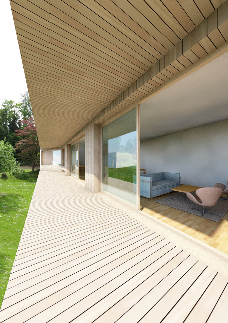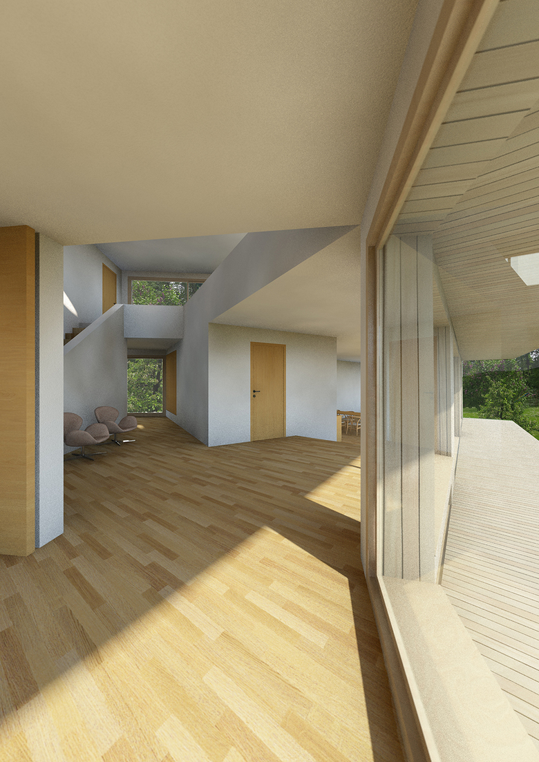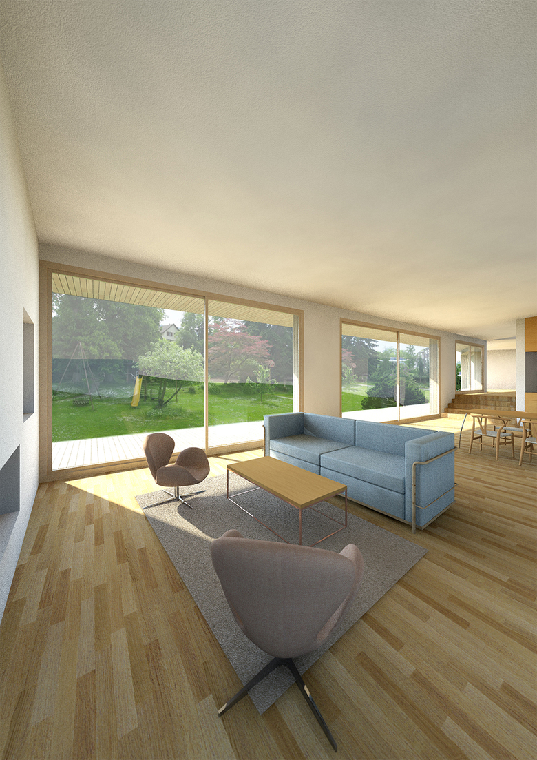 Die Wohnung wird betreten über eine 2-geschossige Halle, die alle Räume der Wohnung miteinander verbindet und Grosszügigkeit schafft. Durch die Absenkung des Wohnzimmers um einige Stufen wird der Kontakt zum Garten noch verstärkt. Eine gedeckte Veranda verbindet alle Räume im Erdgeschoss, das Vordach schützt die Räume vor direkter Sonneneinstrahlung im Sommer und bildet zugleich die Terrasse für die Zimmer im Obergeschoss.