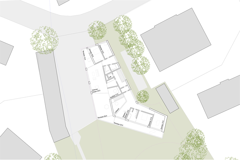 Die Liegenschaft Weinhalde zeichnet sich einerseits durch die Hofsituation mit dem bestehenden, niedrigen Garagengebäude aus, andererseits durch die schöne Gartenanlage im südlichen Teil der Parzelle. Der Neubau gliedert sich in zwei Teile, einen „Strassenflügel“ in dessen Sockel sich die Garage und Zugang befinden, in den Obergeschossen die extern vermieteten Wohnungen und der „Gartenflügel“, in dem die Hauptwohnung untergebracht ist. Das Volumen ist niedrig gehalten und schafft so einen guten Übergang zu den bestehenden Garagen. Auf ein eigentliches Attikageschoss wurde verzichtet, die zwei 3.5 Zimmerwohnungen konnten so übereinander angeordnet werden, was die Baustruktur vereinfacht.