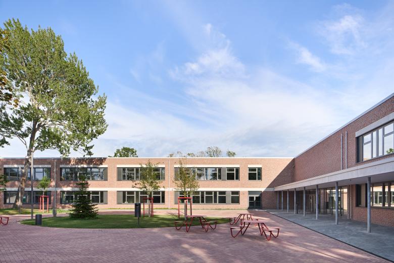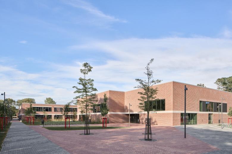 Aufgereiht wie an einer bewegten Perlenkette folgen die Neubauten für das Gymnasium und die Gemeinschaftsschule in Oldenburg der Typologie des aus den 1960er Jahre stammenden Hauptgebäudes: Ein zweigeschossiger roter Klinkerbau, der seinen introvertierten Charakter durch einen großzügigen Innenhof erhält und durch offene, klare Grundrisse überzeugt.