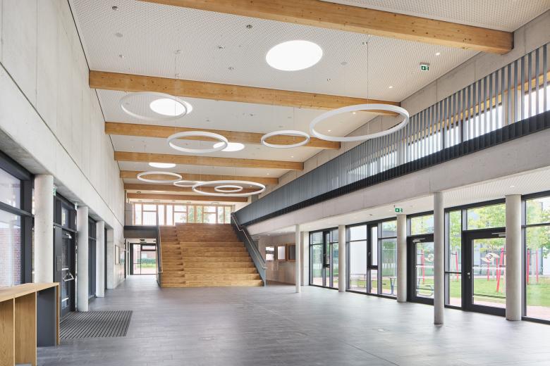 Wo bisher die Schülerinnen und Schüler des Gymnasiums auf dem Sportplatz zu Höchstleistungen angespornt wurden, entstanden drei Neubauten: Ein gemeinsamer Fachklassentrakt, die neu angesiedelte Gemeinschaftsschule und eine Sporthalle am Kopf des Grundstücks. Trotz der räumlichen Zusammenlegung bleibt die Eigenständigkeit beider Schulen durch eine konsequente funktionale Trennung erhalten. Dank lichtdurchfluteter Fach- und Klassenräume und multifunktionaler Erschließungszonen mit individuellem Mobiliar, werden hier nicht mehr ausschließlich sportliche Bestleistungen erbracht, sondern ebenso gestalterische oder mathematische. Es werden nicht nur Schulfeste in der großzügigen Halle der Gemeinschaftsschule stattfinden können oder Konzerte in der bestehenden Aula, sondern auch öffentliche Veranstaltungen der Stadt in der bis zu 1.000 Gäste fassenden Sporthalle. Das gesamte städtische Umfeld – vom Stadtpark bis zum Tennisplatz – erhält durch den Schulcampus neue Impulse!
