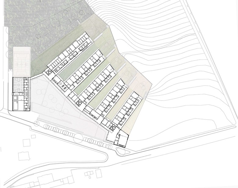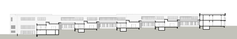 Der erhöhte Vorplatz bildet das stadträumliche „Foyer“ der Schule. Die Haupteingänge, zu denen die Kinder mit Bussen gebracht werden, befinden sich auf der Ebene dieses leicht ansteigenden Plateaus. Von den Eingängen gelangt man sowohl in den ansteigenden Hauptkorridor, als auch dezentral in die jeweiligen Schulbereiche, die sich ebenerdig zu den Gartenhöfen orientieren. Die innere Organisation bildet ein einfaches Orientierungssystem, das aufgrund der starken visuellen Beeinträchtigung der Kinder mit hierarchisierten Wegebeziehungen arbeitet. Es wird durch das Erlebnis der Topographie im Gebäude gestützt. Der Hang wird damit gleichsam zum bestimmenden organisatorischen Kriterium.