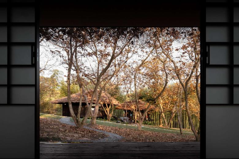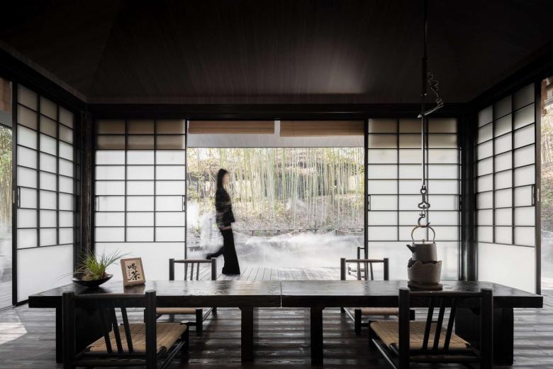 The Woodland Tea House’s interior features a black wood base, with semi-transparent shoji screens dividing the space — balancing tranquility with natural light penetration. Its minimalist layout enhances the Zen vibe, while large openings frame the outdoor scenery. Over tea, visitors fully immerse themselves in the symbiotic beauty of shifting light, shadow and mountain charm.