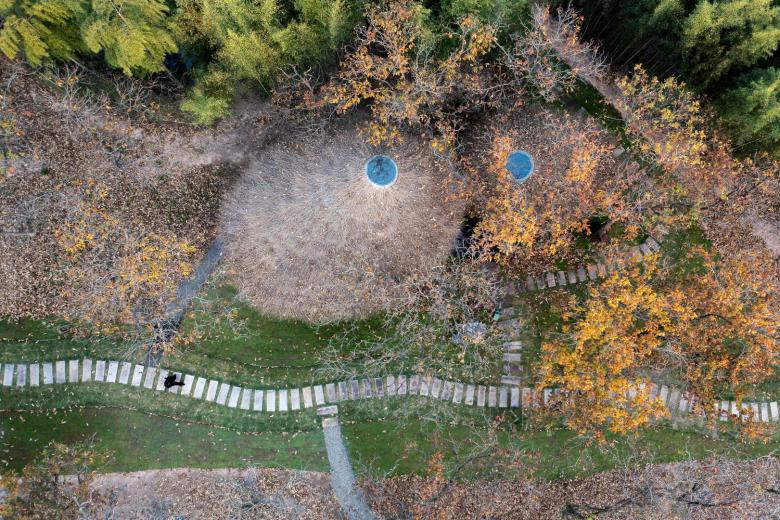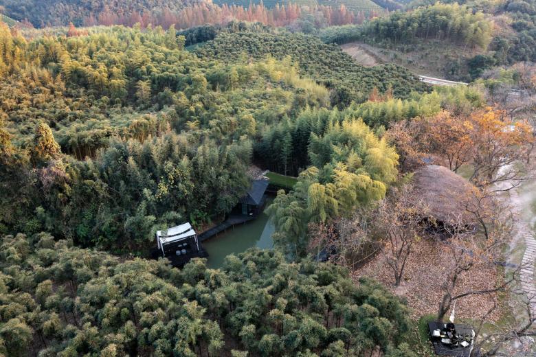 Upon arrival, the Woodland Serving Area comes into view; inspired by the rounded shape of chestnut burrs and echoing the Zen philosophy of harmony and openness, this softly contoured serving & photo spot with bamboo-slat roofing is framed by chestnut groves and bamboo shadows, blending local chestnut forest culture with tea-tasting experiences and inviting visitors to immerse themselves in the harmonious coexistence of nature and humanity with a unique rustic vibe.
