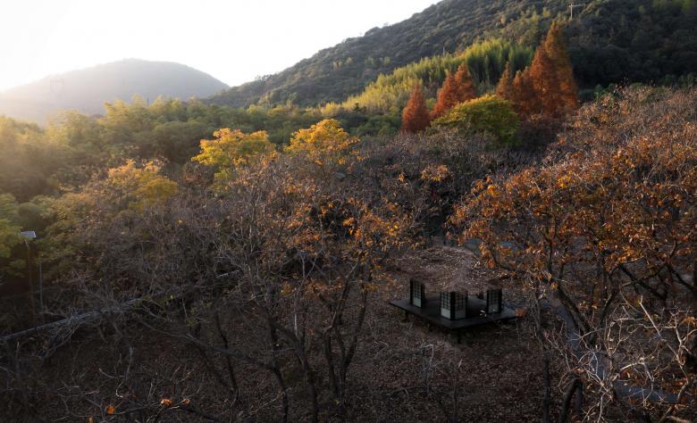 The Woodland Tea House lies opposite the serving area, hidden in the chestnut grove. Designed with the core idea of "blending into nature", it uses an elevated lightweight steel structure to maximize preservation of native vegetation and terrain. From a hillside view, the tea house blends into the wooded slope, blurring the line between man-made structures and nature.