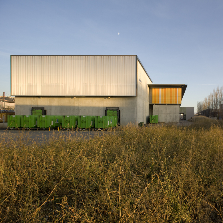 D’une apparente simplicité, le projet prend la forme d’une toiture plate sous laquelle sont rassemblées les diverses activités associées au fonctionnement du centre de logistique. Comprenant une déchèterie pour professionnels, un centre de compactage et de transbordement des déchets, un centre intercommunal de tri des déchets recyclables, un garage poids lourds, des bureaux et un réfectoire, le bâtiment compose subtilement avec toute cette machinerie. Bien que disparate dans ses affectations, l’ensemble s’harmonise grâce à la composition de l’enveloppe. Une peau translucide emballe le bâtiment en lui conférant une certaine légèreté et théâtralise à travers différentes couleurs les viscères du bâtiment.