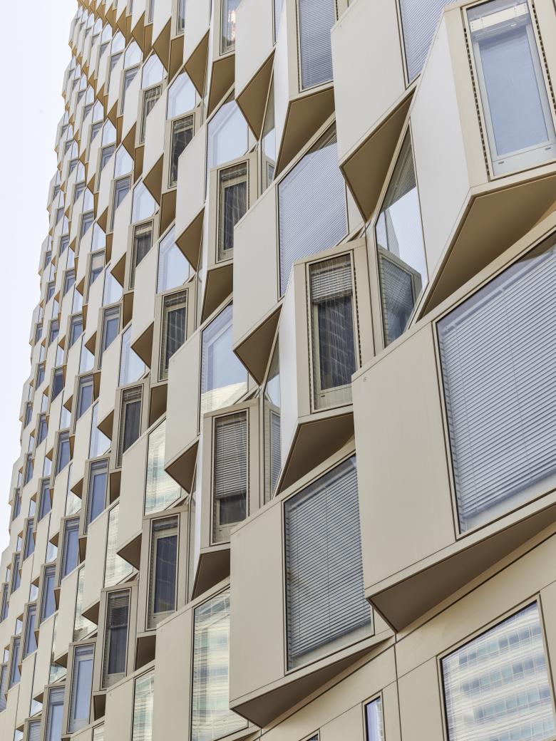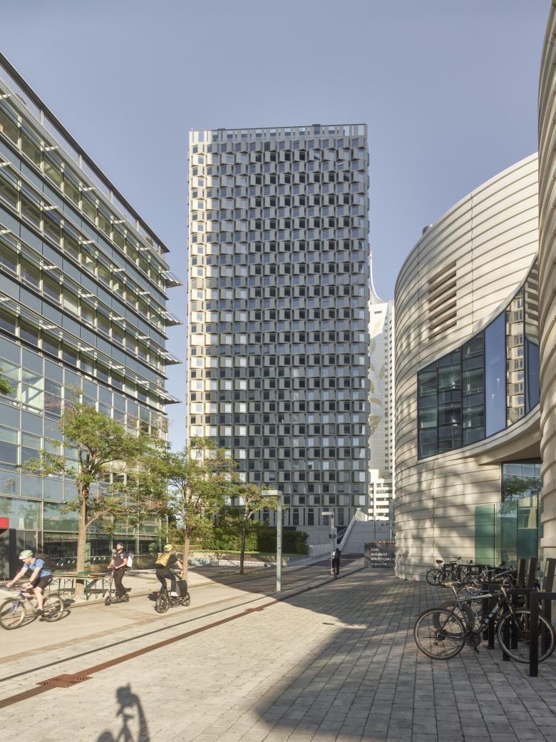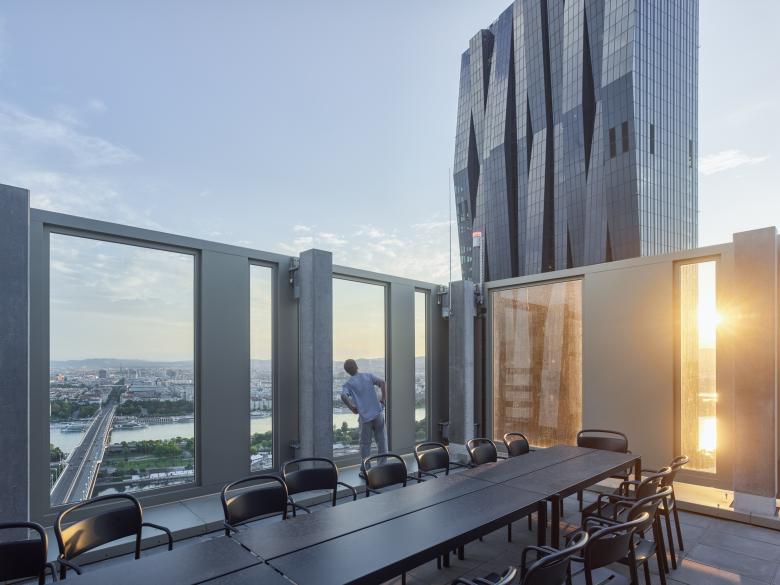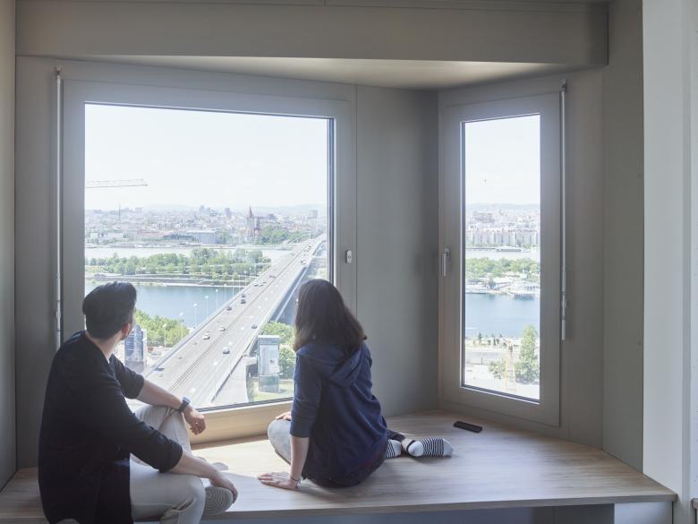 Der DC Tower 3 auf der Donauplatte im Norden Wiens vervollständigt das Ensemble mit den beiden von Dominique Perrault entworfenen Bürotürmen DC 1 und DC 2 und bietet 832 Studenten-Apartments. Auf mehreren Ebenen wird das 100 Meter hohe Gebäude mit öffentlichen Plätzen und Wegen fußläufig an das bestehende Quartier der Donaucity und an das Verkehrsnetz angebunden. Eine verglaste Zäsur in der Mittelachse bringt Tageslicht in den Gebäudekern, der mit großzügigen, zweigeschossigen Erschließungszonen punktet. Die Ausstülpungen der dreidimensional verformten Fassadenelemente finden im Inneren ihre Entsprechung in gemütlichen holzverkleideten Alkoven, die aus jedem Zimmer den Blick zur Donau und über die Stadt rahmen.