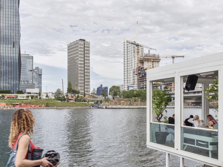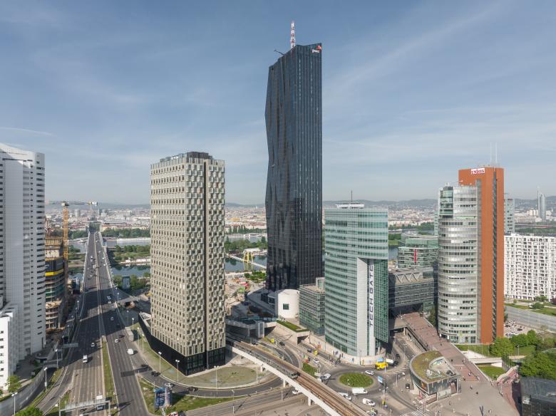 Das schmale Grundstück – kaum mehr als eine Verkehrsinsel, umspült von Wagramerstraße, Autobahnauffahrt und U-Bahnlinie – stellte uns bei der Planung vor große Herausforderungen. Doch die attraktive Lage an der Donau mit Blickachse zum Stephansdom und die prominente Nachbarschaft mit UNO-City, den Perrault-Türmen DC 1 und DC 2 sowie dem Hochhaus von Harry Seidler waren es wert, dieses Wagnis einzugehen.