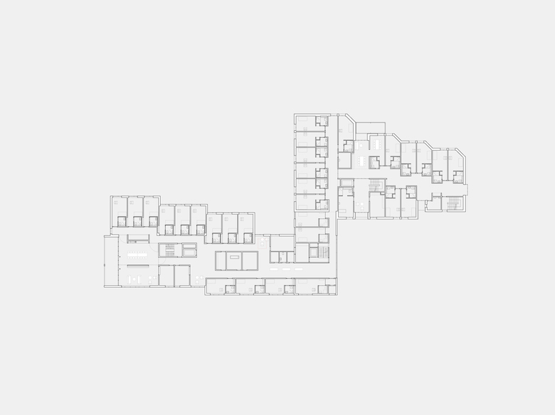 In den Obergeschossen sind alle Abteilungen direkt und barrierefrei mit dem Neubau verbunden, wodurch die Bewohner Bewegungsfreiheit auf dem gesamten Geschoss haben. Der Neubau wird mittels zentral angeordnetem Lift- und Treppenkern erschlossen. Ein weiterer freistehender Kern mit Nebenräumen sorgt in Verbindung mit dem Erschliessungskern für einen fliessenden Raum, welcher durch Nischen rhythmisiert wird. Hierdurch wurden verschiedene Aufenthaltssituationen geschaffen. Die einladende Erschliessungs- und Kommunikationszone mündet in den grosszügigen Aufenthaltsraum mit vorgelagerter Loggia, der Aussichten in die Weite der Landschaft freigibt.