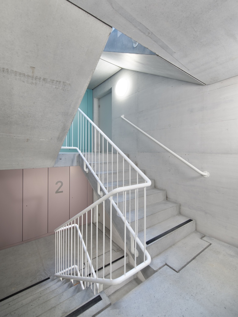 Auf Erdgeschossebene profitieren die im Neubau platzierten öffentlichen Bereiche wie Cafeteria, Speisesaal und Mehrzweckraum von der Mittag- und Abendsonne.