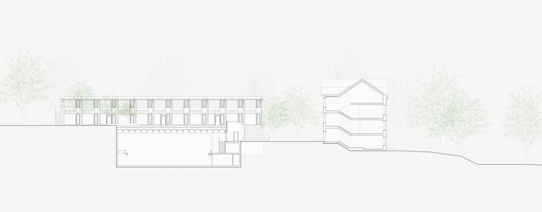 Mit den beiden vorgeschlagenen Neubauten, soll das räumliche Prinzip der Terrassierung beibehalten, jedoch die Beziehung der verschiedenen Niveaus gestärkt werden. Der zentrale Pausenplatz wird über eine grosszügige Treppe mit dem oberen Pausenplatz und dem Sportbereich verbunden und gegen Norden hin geöffnet. Die ortspezifische Stufenlandschaft wird dadurch sicht- und erlebbar gemacht und zudem programmatisch gestärkt.Ein langgezogenes Volumen schliesst das Geviert zum steil abfallenden Hang im Osten ab, ein quadratischer Flachbau im Westen bildet den Dreh- und Angelpunkt und schafft eine adäquate Adressierung der Schule. Die Turnhalle ist halbvergraben und zeichnet die Terrassierung präzise nach.