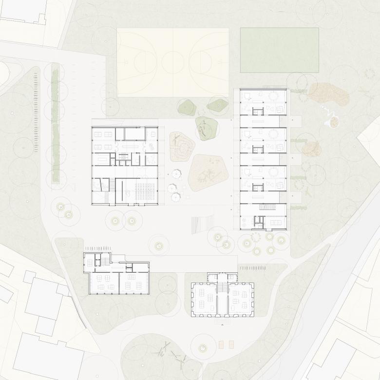 Organisation / Die Schule bleibt in ihrer Organisationsstruktur ähnlich. Die beiden Altbauten werden von Klassenzimmer (Neues Schulhaus) bzw. der Hortnutzung (Altes Schulhaus) entlastet, so dass Räume für Gruppen- und Therapieräume frei werden. Der neue Längsbau ergänzt die beiden bestehenden Bauten als drittes Schulhaus, mit Klassenzimmern, den Kindergärten und der Bibliothek.Der quadratische Neubau umfasst das Foyer der Turnhalle, den Hort sowie den Saal. Letztere haben einen direkten Bezug zum neuen oberen Pausenplatz und ermöglichen verschiedenste Synergien für Schüler- oder Elternanlässe aber auch für Fremdvermietungen.