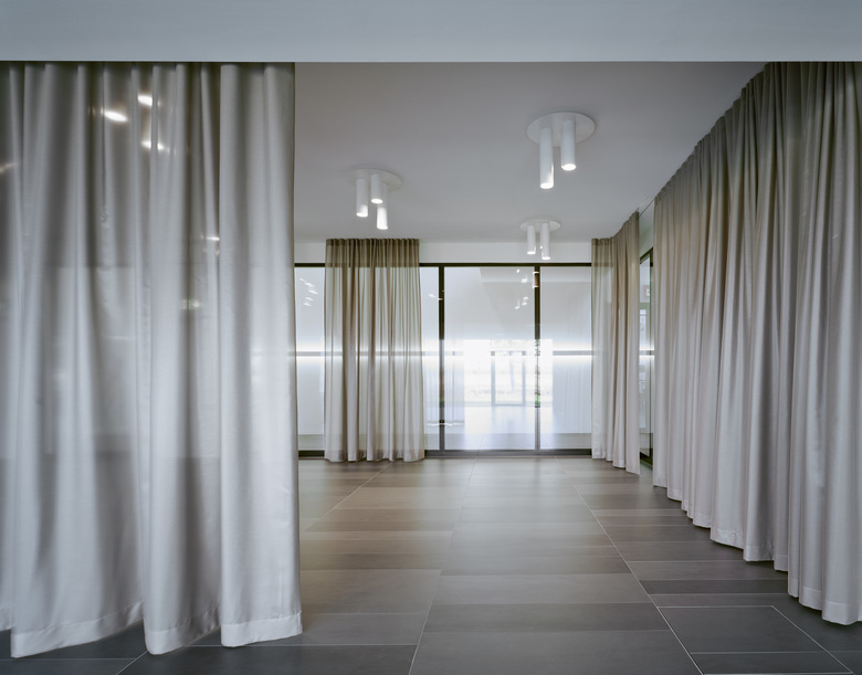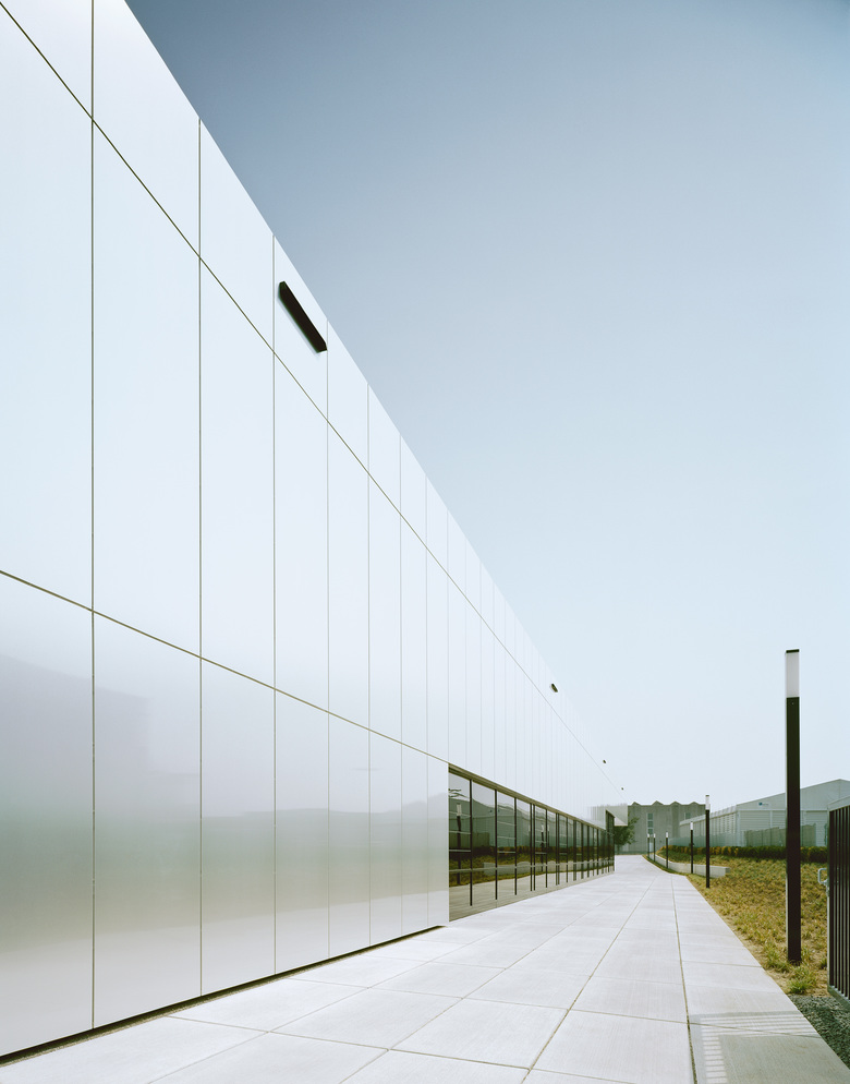 Von Außen ist es als präzises Werkstück geformt mit einer glatten glänzenden metallenen Haut und Einschnitten die als handwerkliche Fräsungen in diesem Werkstück gelesen werden können. Eine über die gesamte Gebäudelänge geführte Fuge bildet die offene Kommunikation und das Nebeneinander von Entwicklung und Produktion ab und schreibt die Außenbehandlung des Baukörpers auch im Inneren fort. Verwendete Materialien hier wie Außen: Metall und Glas in unterschiedlichen Behandlungen (glatt, geschliffen, gefräst).