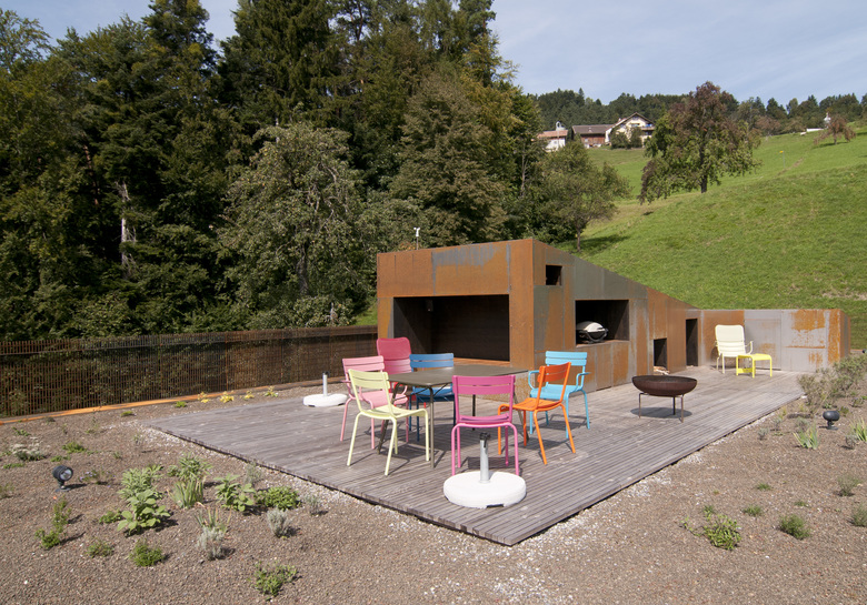 Vom Umlauf gelangt man auf den Dachgarten – ein weiterer «Höhepunkt» des Hauses. Die Idee vom Wohnmöbel wandelt sich auf dem Dach zum Gartenmöbel. Es ist gleichzeitig Strandkorb, Dusche, Gartenhäuschen, Feuerstelle, Sichtschutz, Musikbox, Windschutz, Holzlager und Haustechnik. Der Stahllamellenrost der Fassade bildet je nach Blickwinkel eine fast transparente Brüstung und gewährt auch in Sitzhöhe eine fantastische Aussicht.