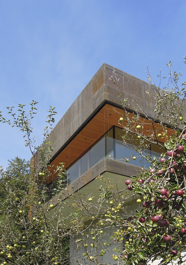Das Wohnhaus mit Atelier steht im Rüden, einem höher gelegenen Ortsteil der Gemeinde Berneck im St.Galler Rheintal. Die Umgebung ist ländlich. Das Hanggrundstück grenzt im Westen an ein bewaldetes Tobel und bietet im Südosten einen fantastischen Blick auf Natur, Berge und Tal. Abgestimmt auf Topografie und Aussicht wurden zwei Quader in den Hang gelegt. Der untere Atelierquader aus Beton liegt quer und ist Auflager für den in Hangrichtung auskragenden Wohnquader, welcher von oxidierenden Stahllamellenrosten umgeben ist. Der Hangcharakter der Parzelle wurde weitgehend belassen, einzig die Zufahrt bildet eine Erschliessungsebene, welche vom Wohnkörper überspannt wird. Alle Volumen und Nutzungen sind in einer Erschliessungsachse über Treppen miteinander verbunden.