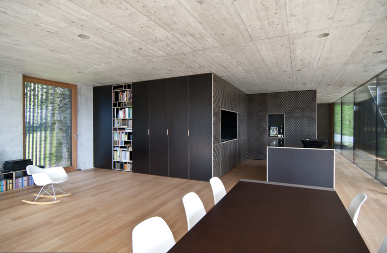 Das darüberliegende Wohngeschoss ist südostseitig vollflächig verglast und umrahmt von einem überdeckten Umlauf. Im Nordwesten geben die Sichtbetonwände nur einzelne Ausblicke in den Wald frei. Unterteilt wird die Wohnebene durch ein raumhohes Möbel aus rotbraunen Mehrschichtplatten. Das Wohnmöbel ist gleichzeitig Zimmer, Schrank, Tapete, Garderobe, Bücherregal, Waschküche, Putzkammer, Küche, Bad, Gäste-WC und Dusche. Es wird entlang der Aussenwände bewohnt und mit Schiebetüren unterteilt.
