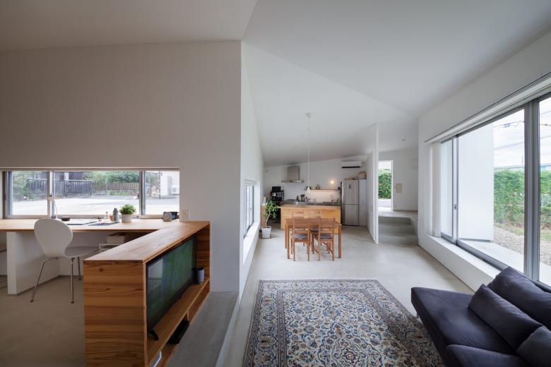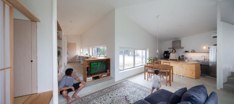 The road to the south of this site is relatively busy, so we kept a reasonable distance from the road while keeping the garden to the south to ensure safety and daylight. The parents' house also has a garden on the south side, but it is small and complete within the large lot. We wanted to create some kind of non-direct relationship between the client's house and his parents' house. We thought that an open space for the annual local festival would be appropriate for the relationship between the two households, while connecting it to the garden of the parents' house.