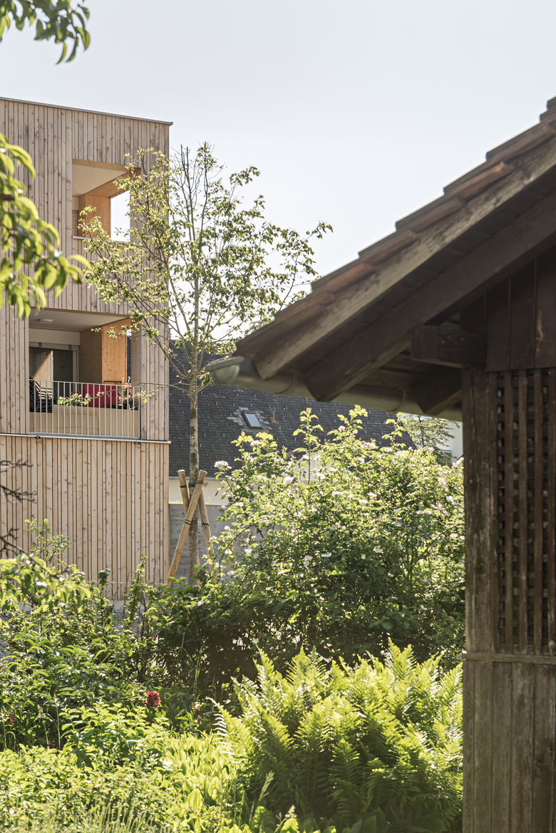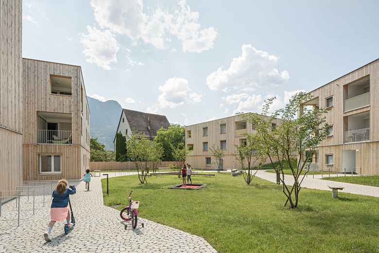 Acht Häuser in Holzhybridbauweise mit 67 großteils geförderten Wohnungen bilden gemeinsam mit dem denkmalgeschützten Bestandsbau ein Ensemble um einen grünen Innenhof. Die unterschiedliche Dimensionierung und Ausrichtung der Baukörper ermöglichen vielseitige Blickbeziehungen mit der umgebenden Berglandschaft und verstärken den Charakter eines gewachsenen Dorfes. Durch eine Tiefgarage bleibt der Großteil der Siedlung autofrei. Die abwechslungsreichen Freiräume sowie ein Gemeinschaftsraum fördern das Zusammenleben innerhalb der Siedlung und darüber hinaus.