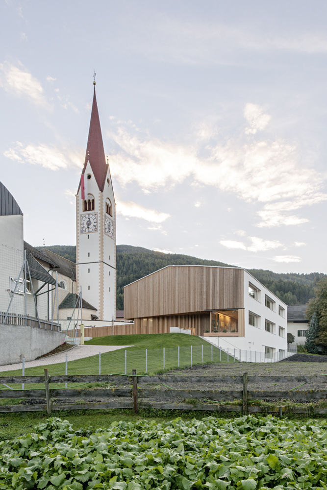 Innerhalb der gewachsenen Dorfstruktur Niederolangs in Südtirol erzählt das Haus des Kindergartens von dem Zusammenspiel zwischen Tradition, dem Zeitgenössischen und der Natur. Im beschaulichen Rahmen ordnet sich der dritte fertiggestellte Kindergarten von feld72 ein, ohne sich unterzuordnen. Selbstverständlich und ungezwungen. Sinnlich an seinem Ort verankert reagiert der Baukörper auf die bestimmende Präsenz der Pfarrkirche St. Petrus und Agnes mit Friedhofskapelle und der Grundschule in der Mitte Niederolangs. Wie in einer Schatulle sitzt der Holzbau in der umlaufenden, massiven Mauer und schenkt Geborgenheit.