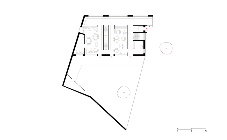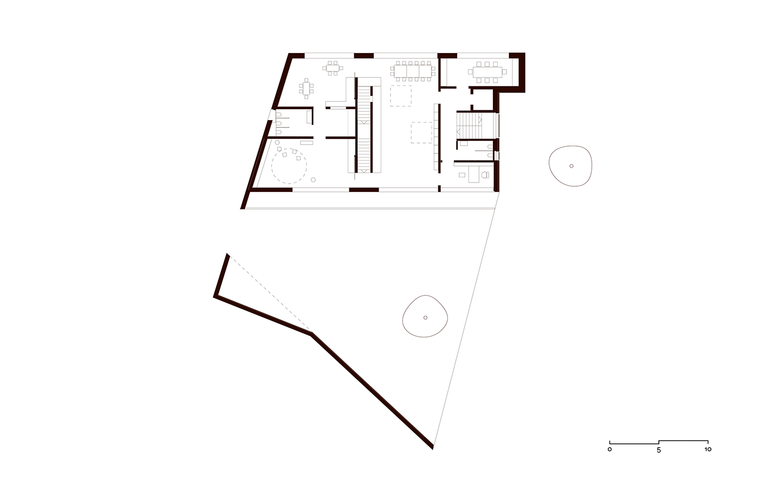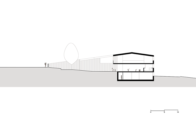 Die Mauer wechselt Materialität und Volumen, so wird sie vom Gartenzaun zur Grenzmauer zum Gebäude und zur Interpretation des Vorgefundenen als auch zum Weiterstricken des Bestandes. Die hofseitig komplett in Holz gehaltene Mauer umarmt in einer freundlichen Geste den Garten der Kinder. Überdachte, wettergeschützte Bereiche entstehen im Übergang zum Gebäude. Es entfaltet sich ein spielerischer Umgang mit dem Element der Mauer. Architektur und Spielplatz verschmelzen. Das traditionelle Element der Umzäunung gewinnt an Komplexität und Aufenthaltsqualität – es beherbergt, rahmt, versteckt, lädt zum Spielen ein und schenkt Ein- sowie Ausblicke. Das Gebäude selbst bleibt dabei klar und wirkt dennoch vielschichtig.