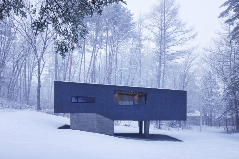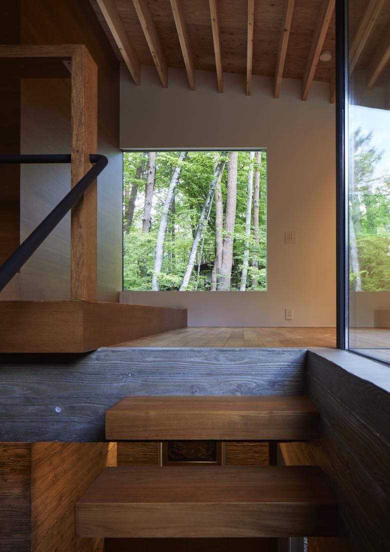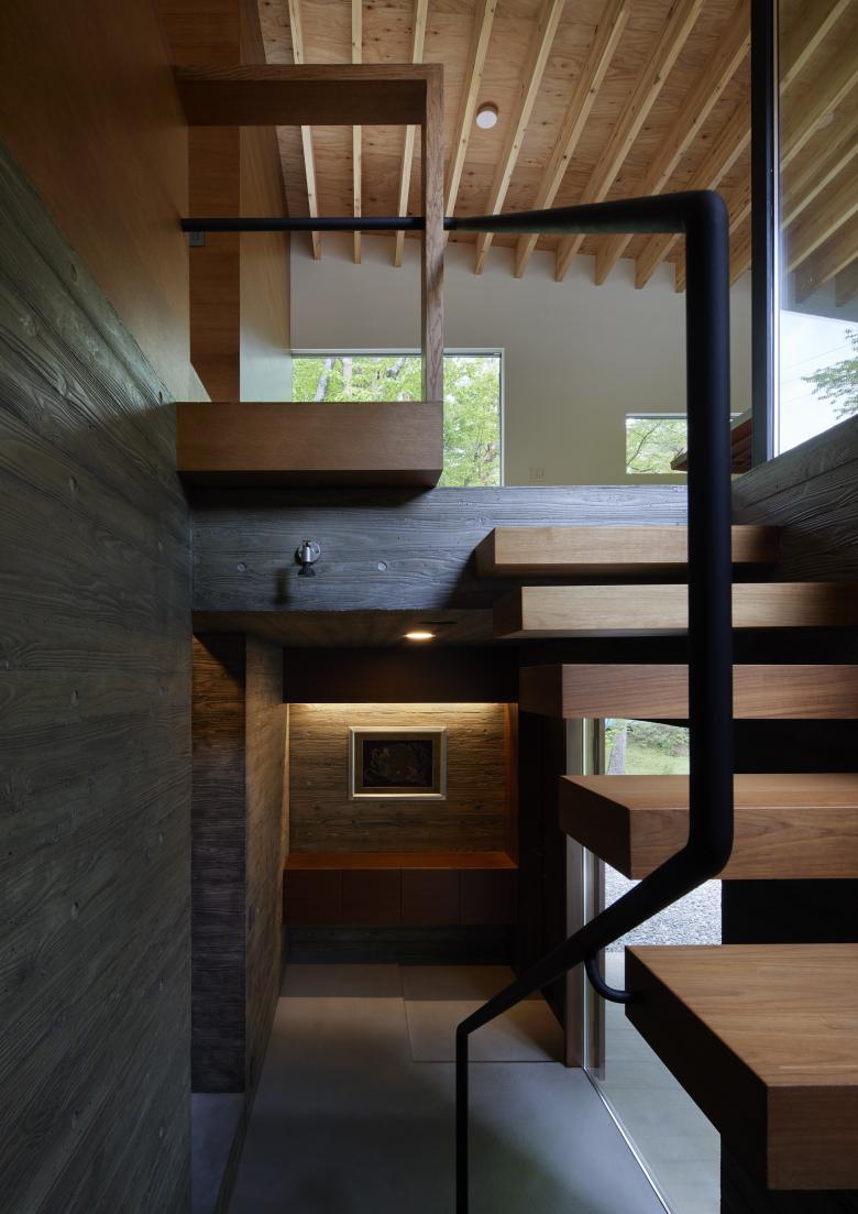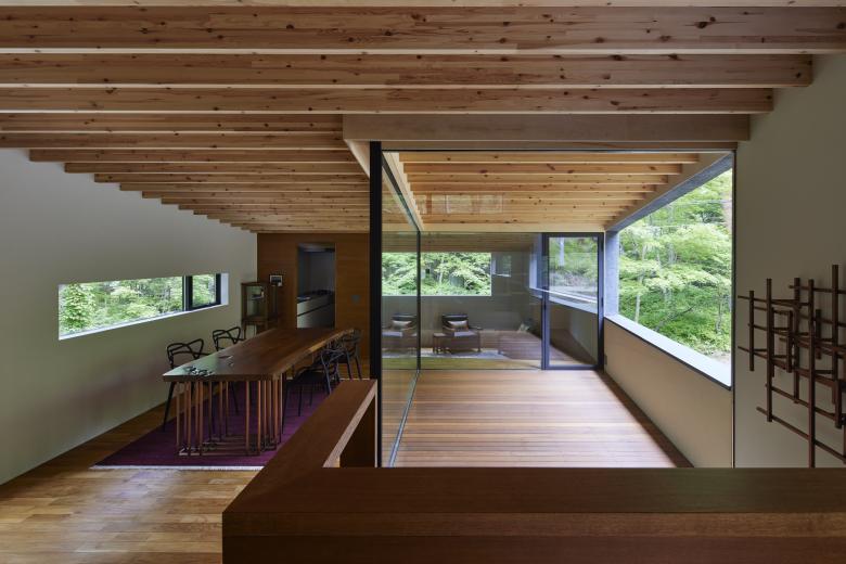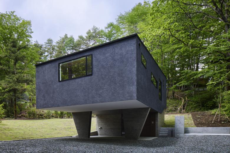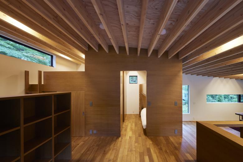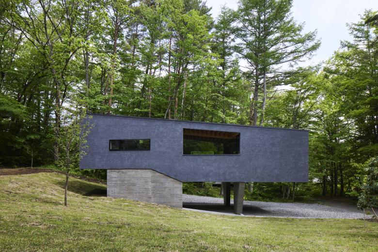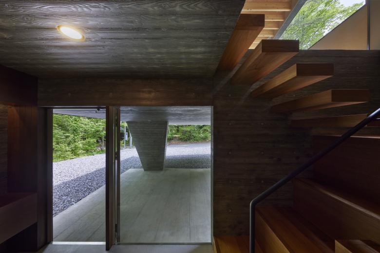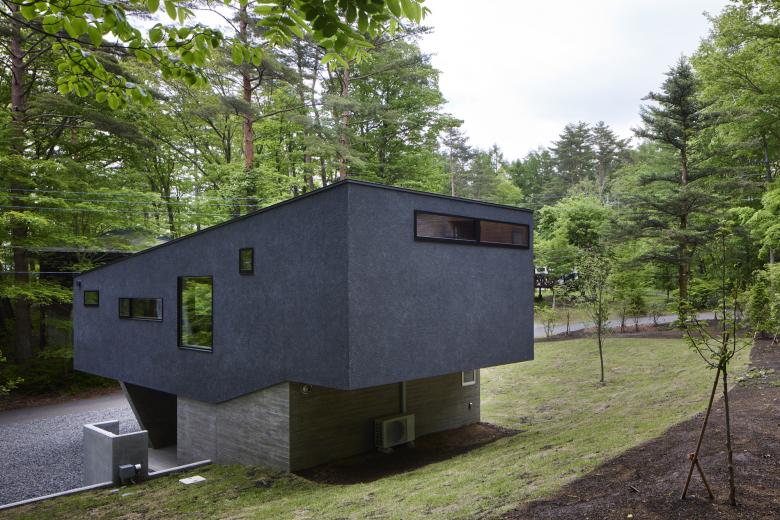 The site is located in a villa area near Kawaguchi Lake. Entering the villa from the entrance and approaching the site through the lush forest, the view suddenly opens up. The surrounding villas are scattered throughout the lush forest, but this site is the only one that has been cleared, with a single coniferous tree about 20 meters high growing on the southern edge. Since there were no trees to block the view from the surrounding road, it was difficult to open the property to the surrounding area unconditionally. Surrounded by a U-shaped curved road, the site has a 3.8-meter difference in elevation, and is a gently sloping site with a slight depression in the shape of a mortar. When I first visited the site, I thought the topography itself was very beautiful. We proceeded with the design while considering how to utilize the beauty of this topography as much as possible.