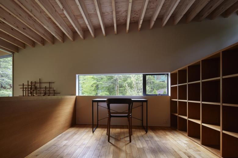 We came up with the image of a simple rectangular building, long in the east-west direction, floating on the north side of the site, touching the slope. Next, the floor was leveled to follow the slope, and finally, the roof was gently sloped in the same direction as the slope. The plan also has a slightly inclined trapezoidal shape, which gives the building a curious appearance that changes depending on the direction of view.