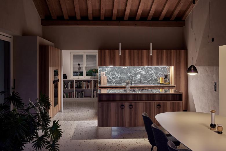 60 Jahre später erfuhr das Wohnzimmer eines schlichten Tiroler Landhauses mit Baujahr 1962 eine Rundum-Verwandlung: über dem Kopf der Sichtdachstuhl, vor den Augen großzügige Glasflächen nach Süden und Westen – so gestaltet sich die Bühne für die offene Küche mit Essplatz, den neuen zentralen Akteur des Hauses. Für den Bauherren und Architekten lag es als leidenschaftlichem Koch nahe, den Fokus auf den freistehenden Küchenblock mit integriertem Herd zulegen. Ebenso wie die Küchenzeile wurde der Monolith in Handarbeit vom Tischlergefertigt. Das Ergebnis fügt sich in seiner Anmutung zeitlos in das bestehende Ensemble ein und wird durch einen zum Esstisch umfunktionierten Besprechungstisch mit aufgearbeiteten Vintage-Stühlen ergänzt. Perfekt unperfekt und dennoch absolut stimmig: die eigens angefertigten Terrazzofliesen sowie der sandfarbene Lehmputz.