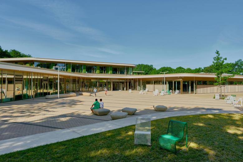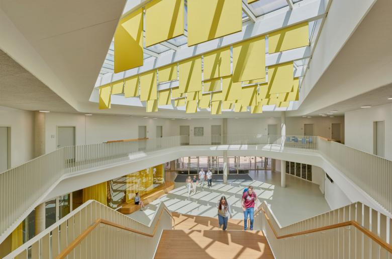 Inside, the look and feel of the new school is determined by a sense of lightness and openness. The overall mood is established by playful features, such as spaces inspired by the idea of a market square and other areas bustling with activity. Light floods into two atria, which provide vertical connections within the building.