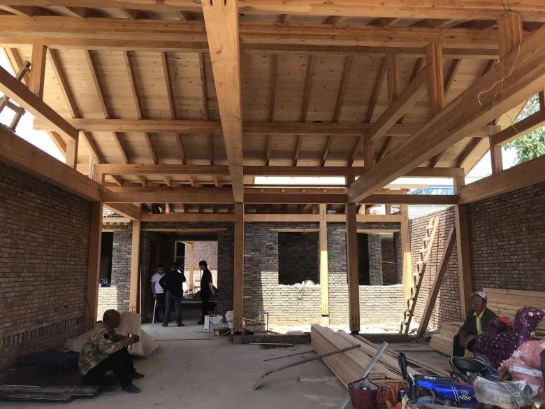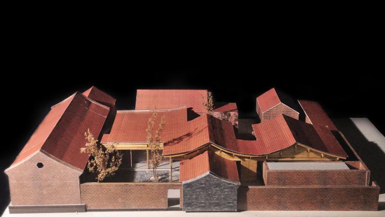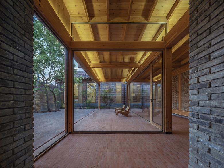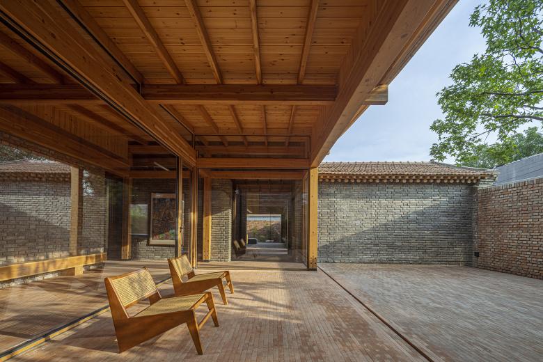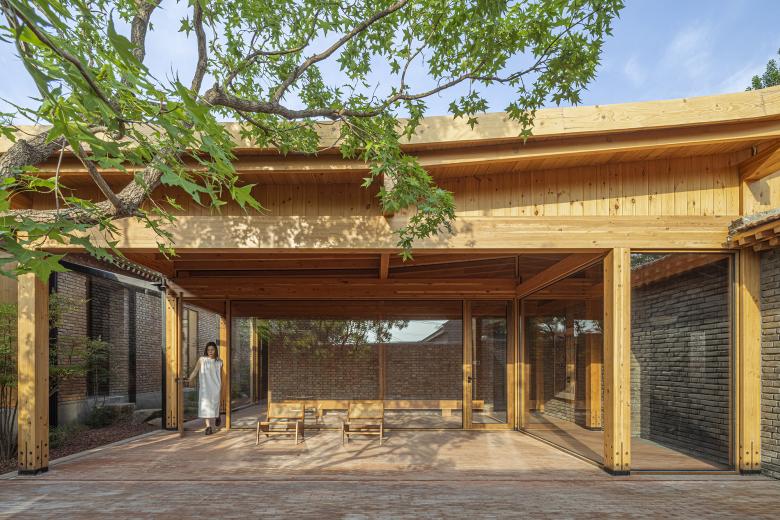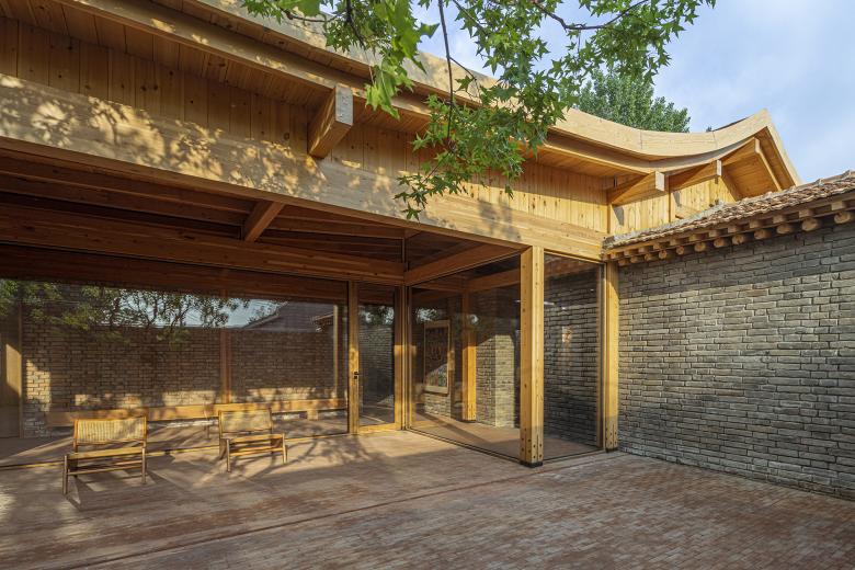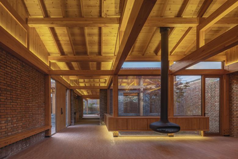 The newly built wooden construction adopts cedar plywood as main material and applies traditional beam-lifted frames, to echo the features of traditional northern Chinese houses. By fully utilizing plywood, a low-carbon and renewable natural building material, the newly inserted wooden construction continues the existing old house's wooden frame with new structural expressions, hence creating a dialogue between the old and the new. Moreover, the undulating new roof is constructed with beams and columns featuring minimized cross sections and maximized spans, to ensure a reasonable structure and control costs.