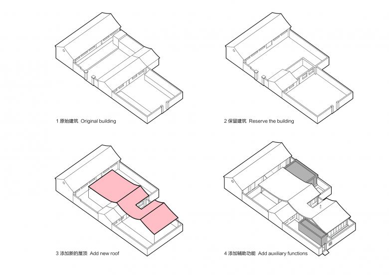 The original architecture is a courtyard compound, consisting of two courtyards, two pitched-tile-roof buildings and several flat-roof volumes. After site investigation, the design team decided to retain and properly transform the north building, which were frequently used and were in good structural condition; to renovate and preserve the south building, which had old structures with historical value; and to dismantle other auxiliary volumes built for temporary use.