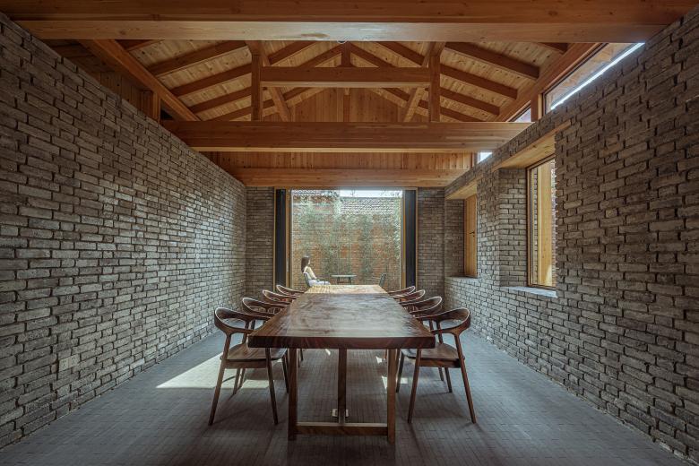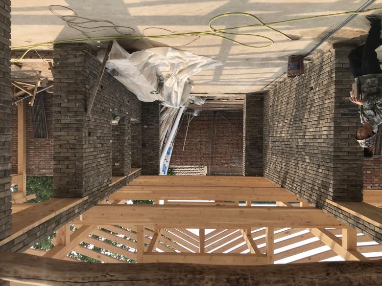 The newly built enclosure walls are completely made of red and gray old bricks recycled locally, which realizes the reuse of waste materials. When renovating the existing buildings, the design team decided to remove and polish the white ceramic tiles on the exterior of the preserved north building to expose its red-brick walls. As demolishing parts of the south building's roof, the designers found that its original structures were seriously damaged and the walls under it were at the risk of collapse. Therefore, they took the roof apart, and replaced some old wooden components with new ones. Meanwhile, the walls were rebuilt with old gray bricks in consistent with their original forms.